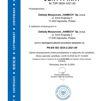 Z radością informujemy, że nasza firma Zakłady Maszynowe Hamech uzyskała prestiżowe certyfikaty spawalnicze EN 1090, EN 3834 oraz EN 15085. To dowód na to, że nasze procesy produkcyjne spełniają najwyższe europejskie normy jakości i bezpieczeństwa. Co to oznacza dla naszych klientów? Większą niezawodność, wyższą jakość produktów i dostęp do innowacyjnych rozwiązań technologicznych.